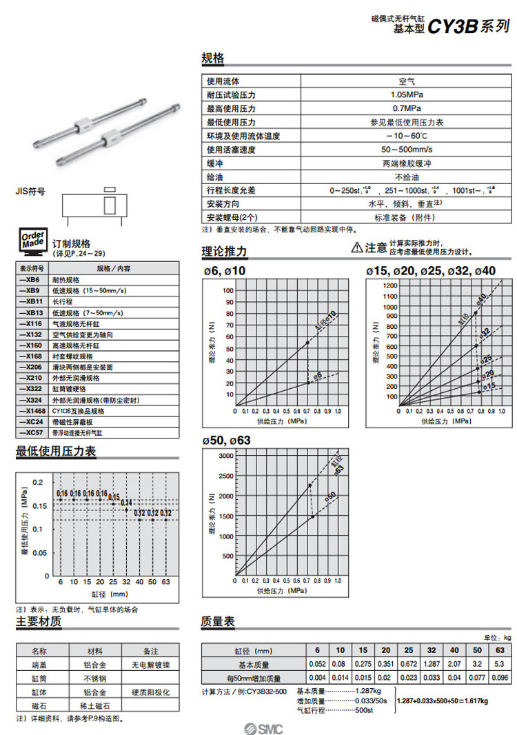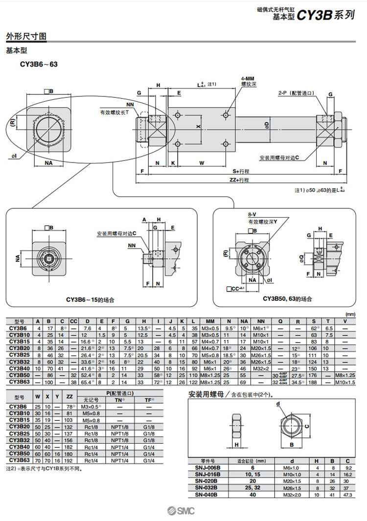 CY3B6,CY3B10,CY3B15,CY3B20,CY3B25,CY3B32,CY3B40,CY3B50,CY3B63,CY3B6-50,SMC磁偶式無(wú)桿氣缸