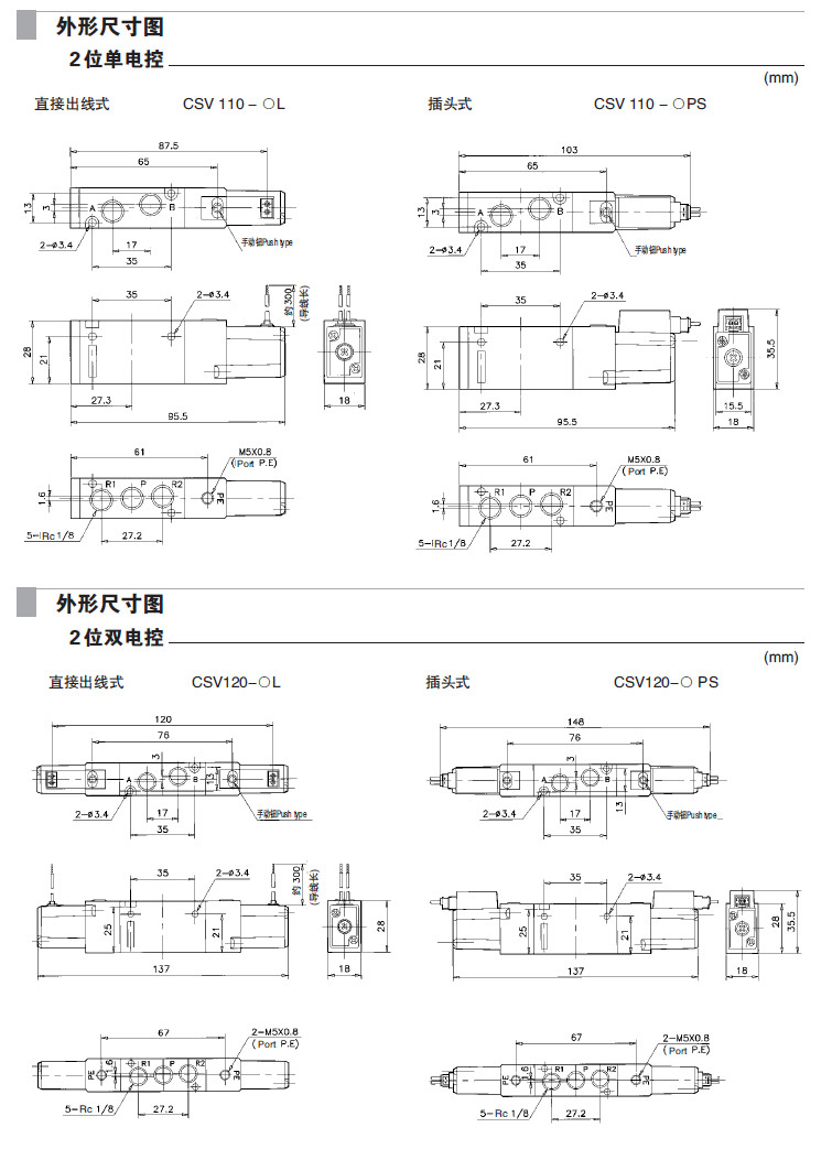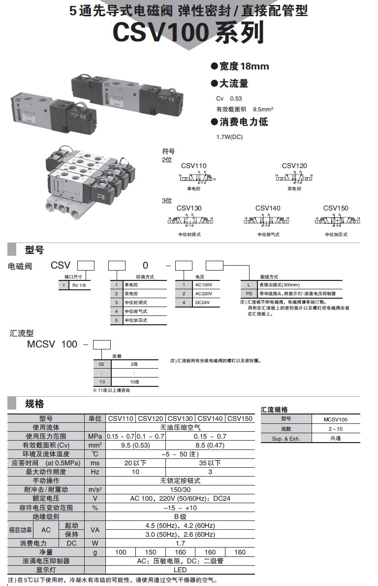 CSV110-1L,CSV120-2L,CSV130-4L,CSV140-1PS,CSV150-2PS,CSV110-4PS,5通先導式電磁閥