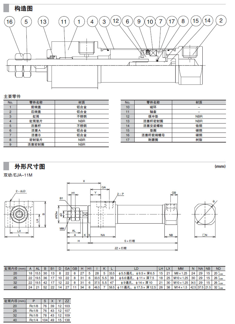 EJA-11M-20,EJA-11M-32,EJA-11M-40,EJB-11M-25,EJB-11M-32,EJB-11M-40,小型氣缸