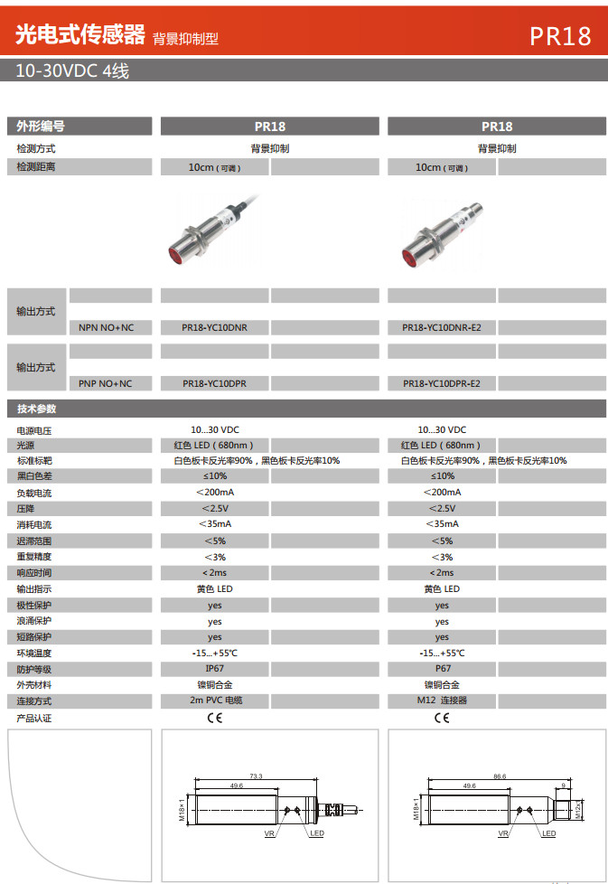 PR18-YC10DNR,PR18-YC10DPR,PR18-YC10DNR-E2,PR18-YC10DPR-E2,光電式傳感器