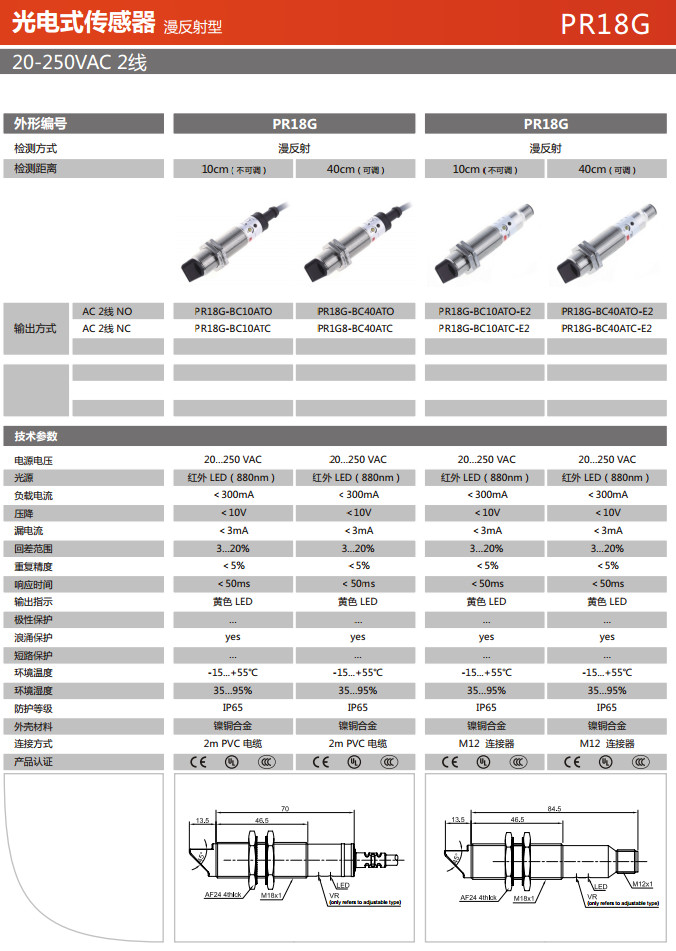 PR18G-BC10ATO,PR18G-BC10ATC,PR18G-BC40ATO,PR1G8-BC40ATC,PR18G-BC10ATO-E2,光電式傳感器