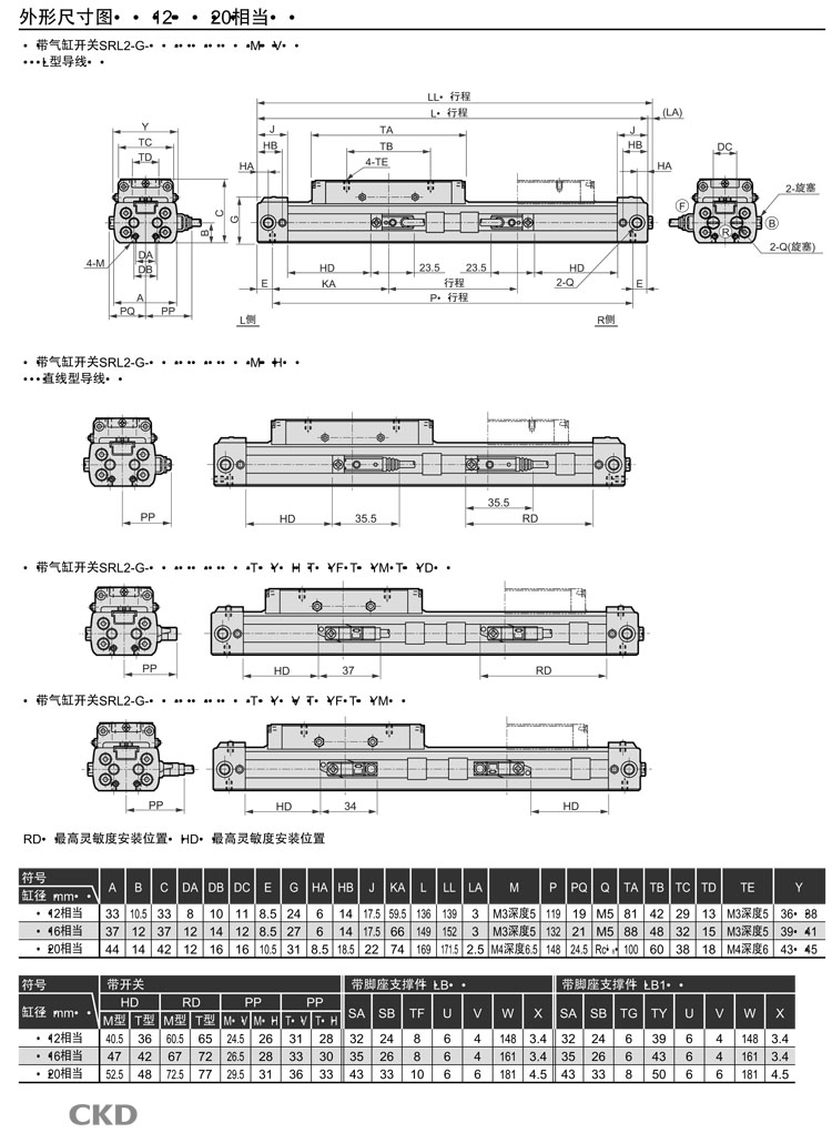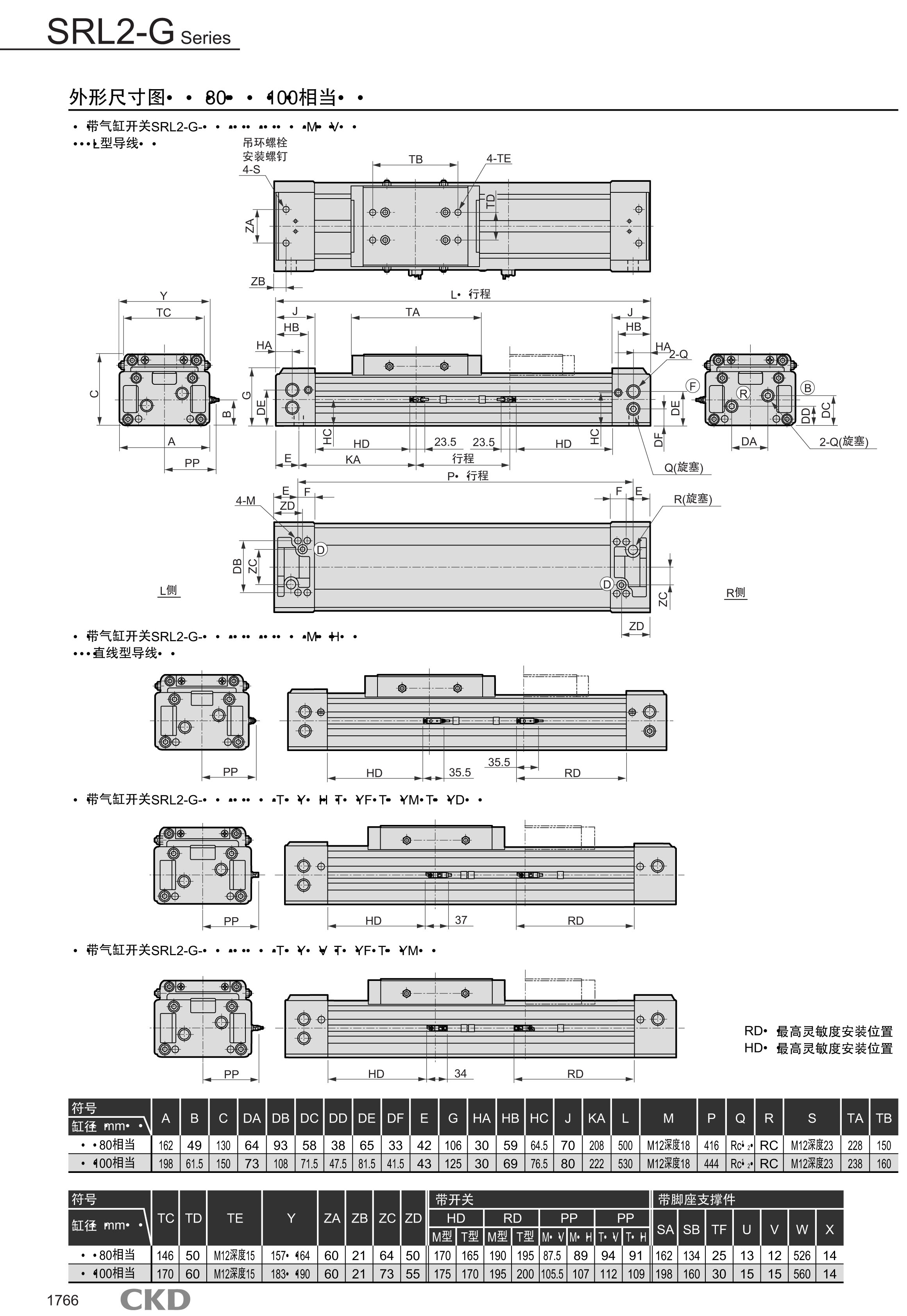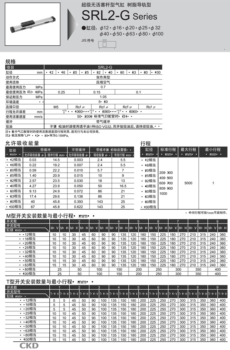 SRL2-G-LB1-25B-200,SRL2-G-LB1-25B-300,SRL2-G-LB1-25B-400,SRL2-G-LB1-25B-500,SRL2-G-LB1-25B-600,CKD超級無活塞桿型氣缸