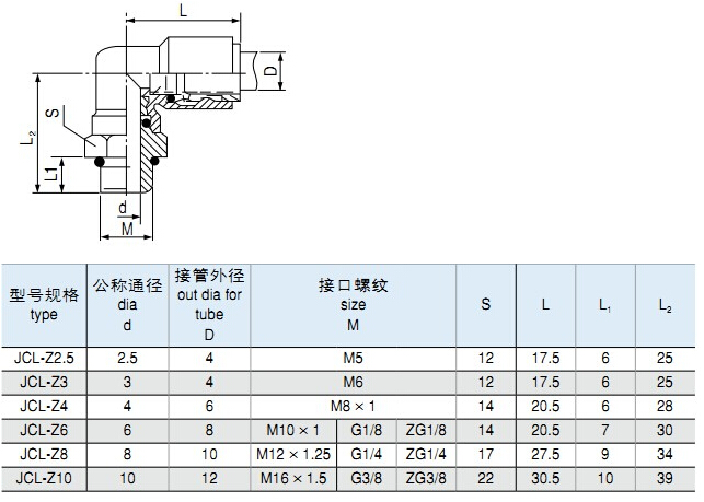 JCL-Z2.5,JCL-Z3,JCL-Z4,JCL-Z6,JCL-Z8,JCL-Z10,插入式直角終端管接頭