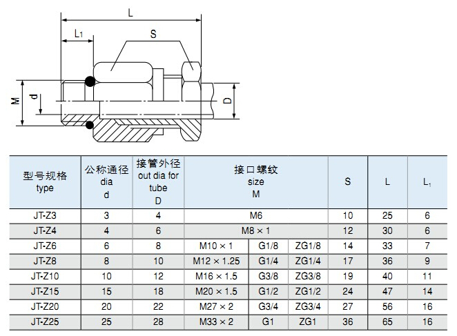 JT-Z3,JT-Z4,JT-Z6,JT-Z8,JT-Z10,JT-Z15,JT-Z20,JT-Z25,卡套式直通終端管接頭 |