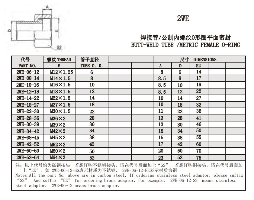 2WE-06-12,2WE-08-14,2WE-10-16,2WE-12-18,2WE-14-22,2WE-18-27,2WE-22-30,2WE-28-36,平面密封接頭