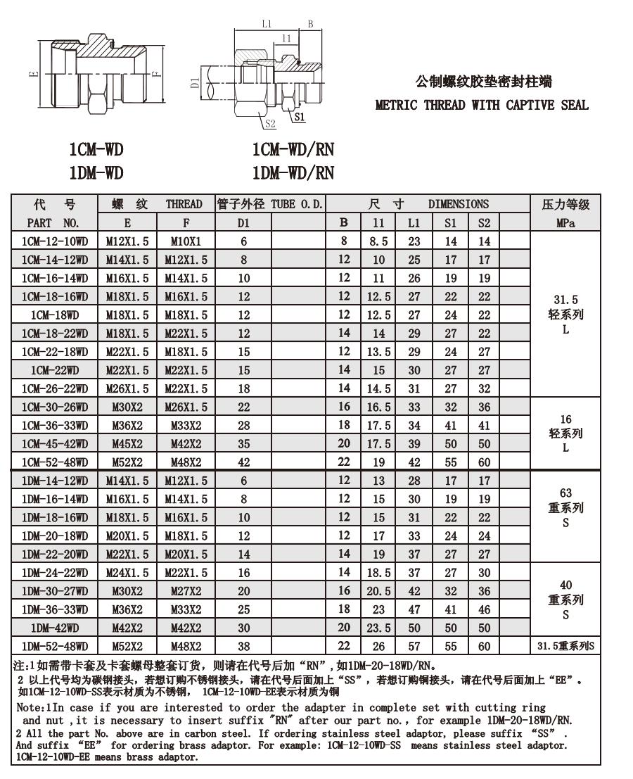 1CM-12-10WD,1CM-14-12WD,1CM-16-14WD,1CM-18WD,1DM-36-33WD,1DM-42WD,1DM-52-48WD,公制螺紋卡套接頭