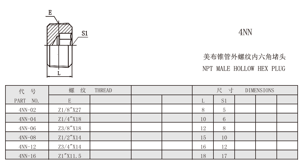 4NN-02,4NN-04,4NN-06,4NN-08,4NN-12,4NN-16,螺紋內(nèi)六角堵頭