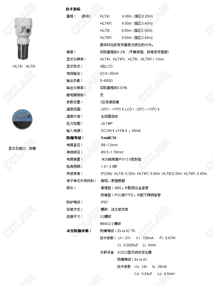 HLT4I,HLT4FI,HLT8I,HLT8FI,HLTI本安防爆型超聲波物位計