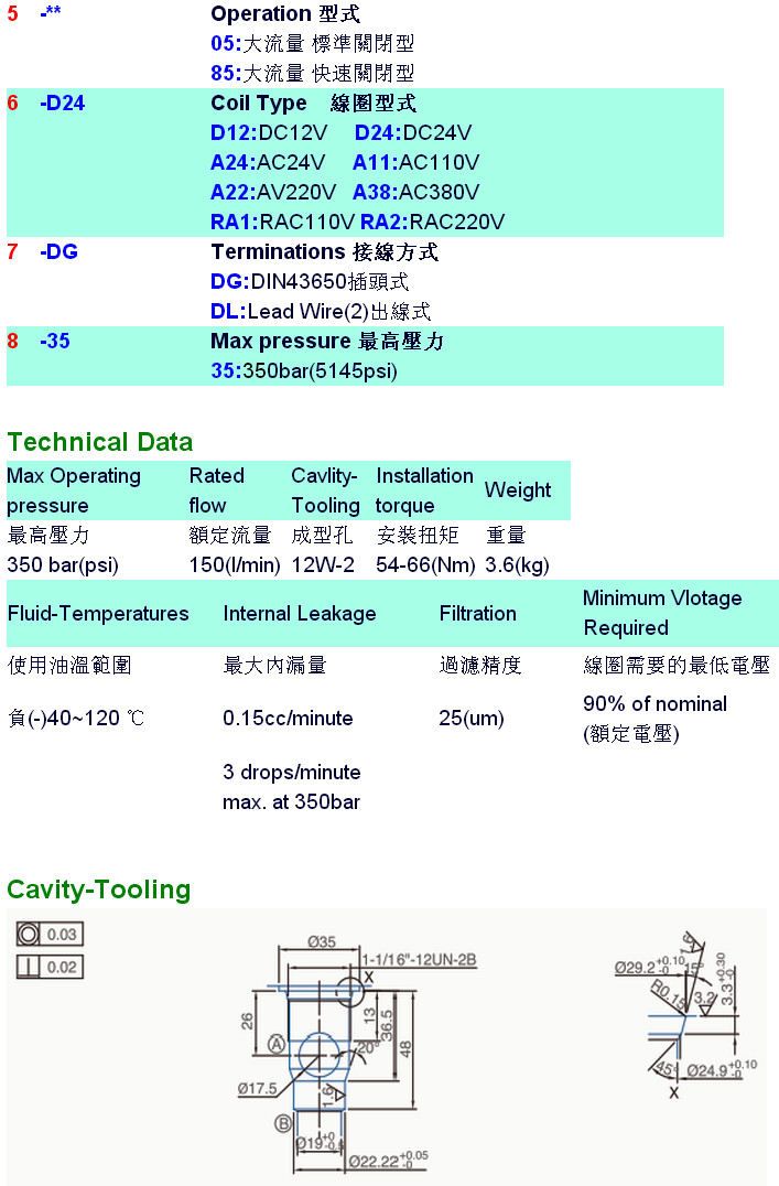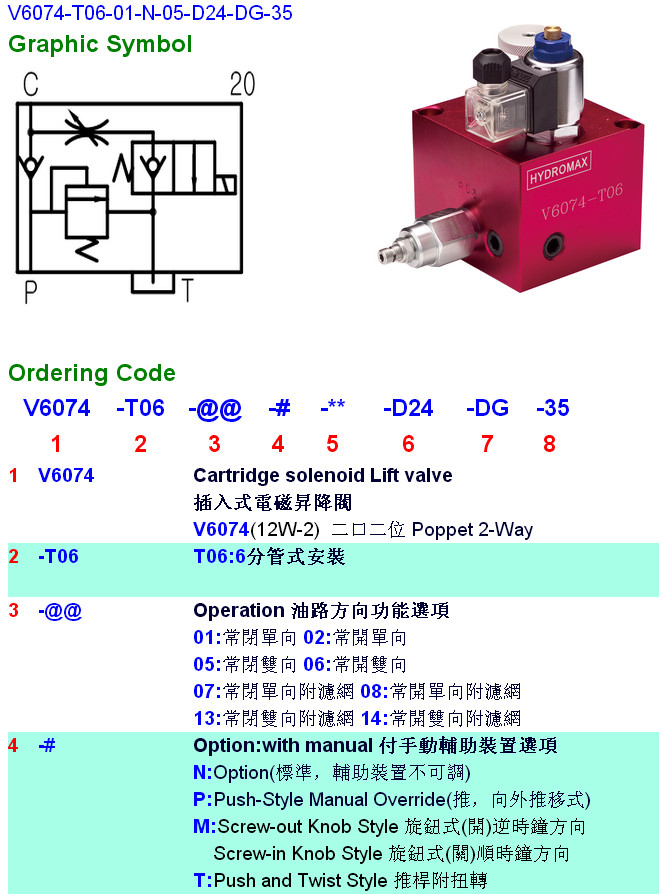 V6074-T06-02,V6074-T06-05,V6074-T06-06,V6074-T06-07,V6074-T06-01-N-05-D24-DG-35,HYDROMAX插入式電磁升降閥