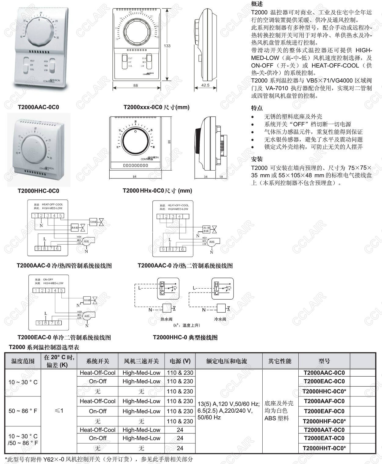 T2000AAC-0C0,T2000EAC-0C0,T2000HHC-0C0,T2000AAF-0C0,T2000EAF-0C0,T2000,線電壓風機盤管溫控 |
