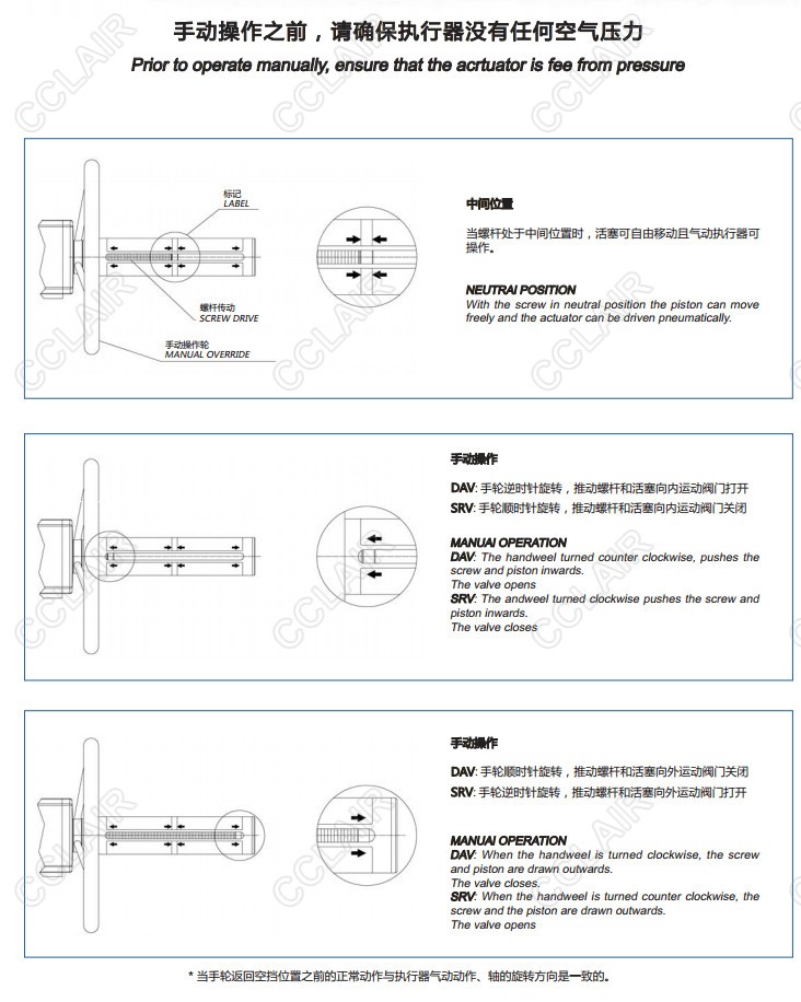 為了保證氣動執(zhí)行器的正常工作,在對手動應(yīng)急手動執(zhí)行任何操作之前必須將氣動執(zhí)行器的氣源斷開。