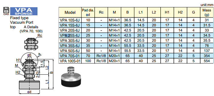 VPA10S-6J,VPA15S-6J,VPA20S-6J,VPA25S-6J,VPA30S-6J,VPA50S-6J,VPA70S-01,VPA100S-01,VPA35S-6J,PISCO真空吸盤 |