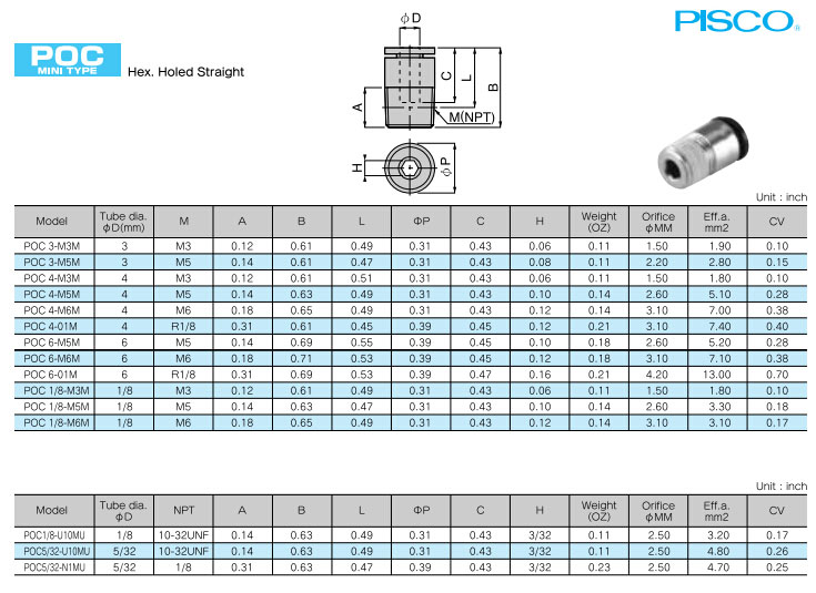 POC3-M3M,POC4-M3M,POC4-M5MPOC6-M5M,POC1/8-U10MU,POC5/32-U10MU,POC5/32-N1MU,PISCO快速接頭