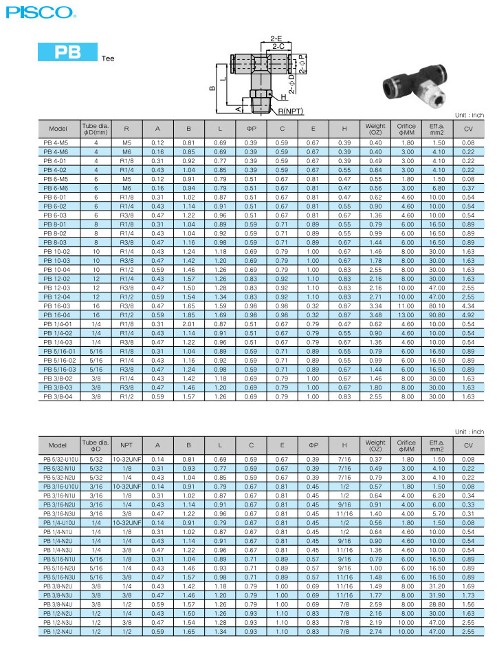 PB5/32-U10U,PB3/16-U10U,PB1/4-U10U,PB5/16-N1U,PB3/8-N2U,PB1/2-N2U,PISCO快速接頭