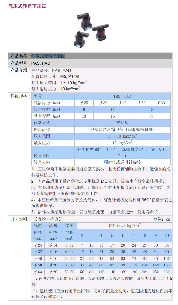 PAS-25,PAS-32,PAS-40,PAS-50,PAS-63,PAD-25,PAD-32,PAD-40,PAD-50,PAD-63,POSU氣壓式轉(zhuǎn)角下壓缸 |