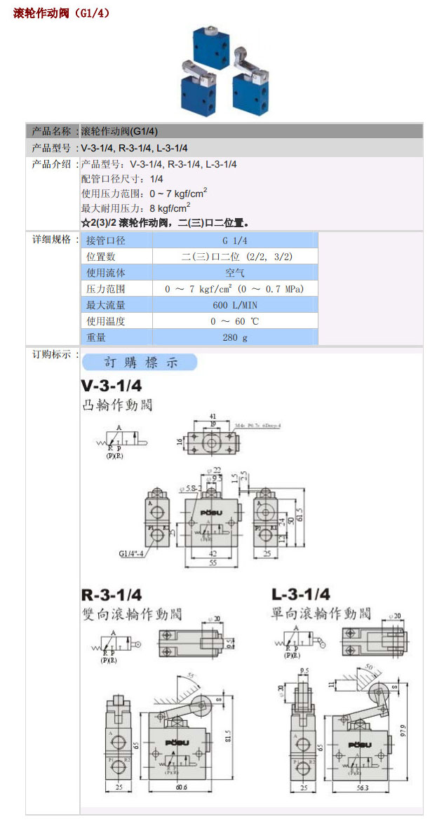 V-3-1/4,R-3-1/4,L-3-1/4,PST滾輪作動閥