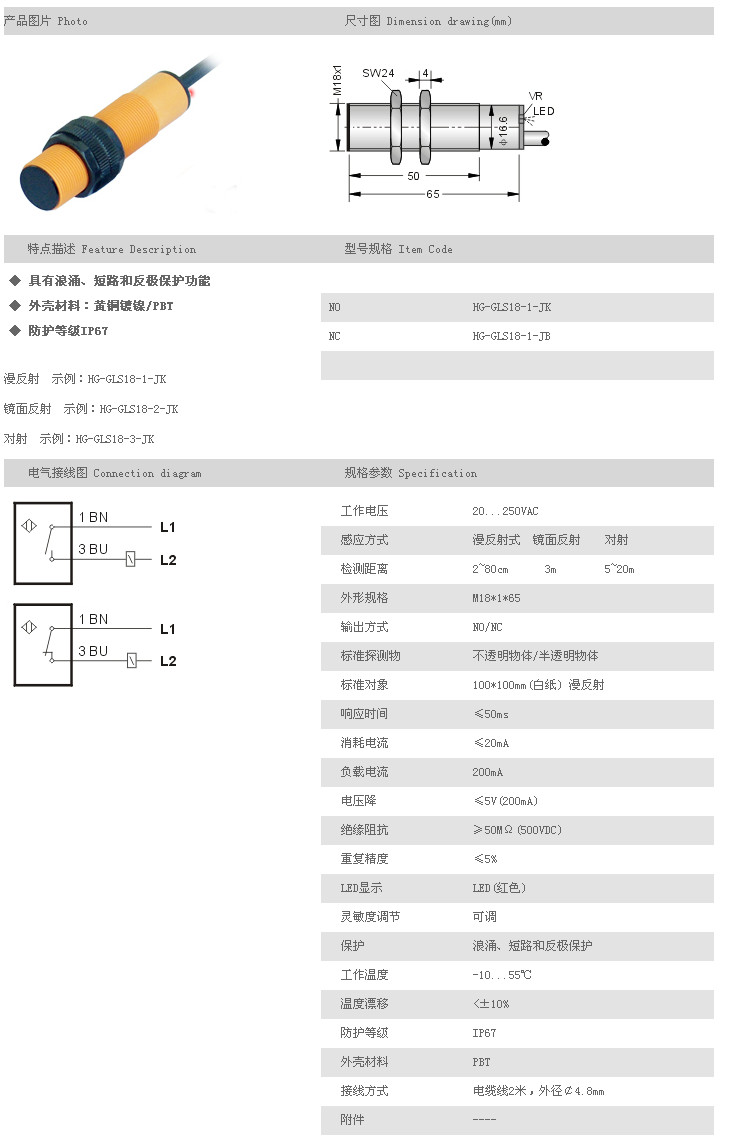 型號: 圓柱型光電開關(guān)/傳感器 HG-GLS18-1-JK,HG-GLS18-1-JB,HG-GLS18-2-JK,HG-GLS18-2-JB,HG-GLS18-3-JK,HG-GLS18-3-JB,