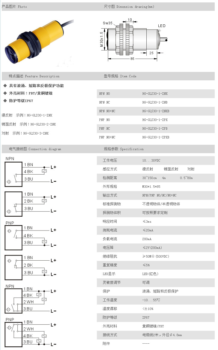 /傳感器 HG-GLS30-1-ZNK,HG-GLS30-1-ZNB,HG-GLS30-1-ZNKB,HG-GLS30-1-ZPK,HG-GLS30-1-ZPB,HG-GLS30-1-ZPKB,HG-GLS30-2-ZNK,HG-GLS30-2-ZNB,HG-GLS30-2-ZNKB,HG-GLS30-2-ZPK,HG-GLS30-2-ZPB,HG-GLS30-2-ZPKB,HG-GLS30-3-ZNK,HG-GLS30-3-ZNB,HG-GLS30-3-ZNKB,HG-GLS30-3-ZPK,HG-GLS30-3-ZPB,HG-GLS30-3-ZPKB,
