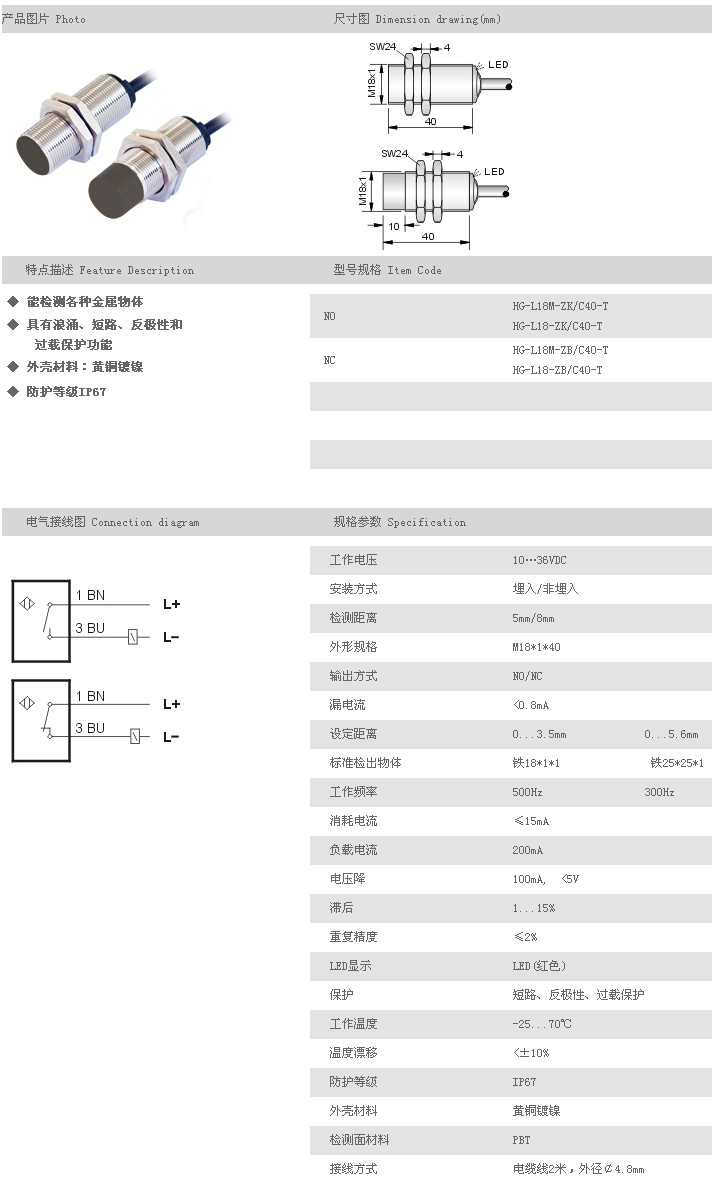 防水/防油/防腐蝕接近開(kāi)關(guān) HG-L18M-ZK/C40-T,HG-L18-ZK/C40-T,HG-L18M-ZB/C40-T,HG-L18-ZB/C40-T,