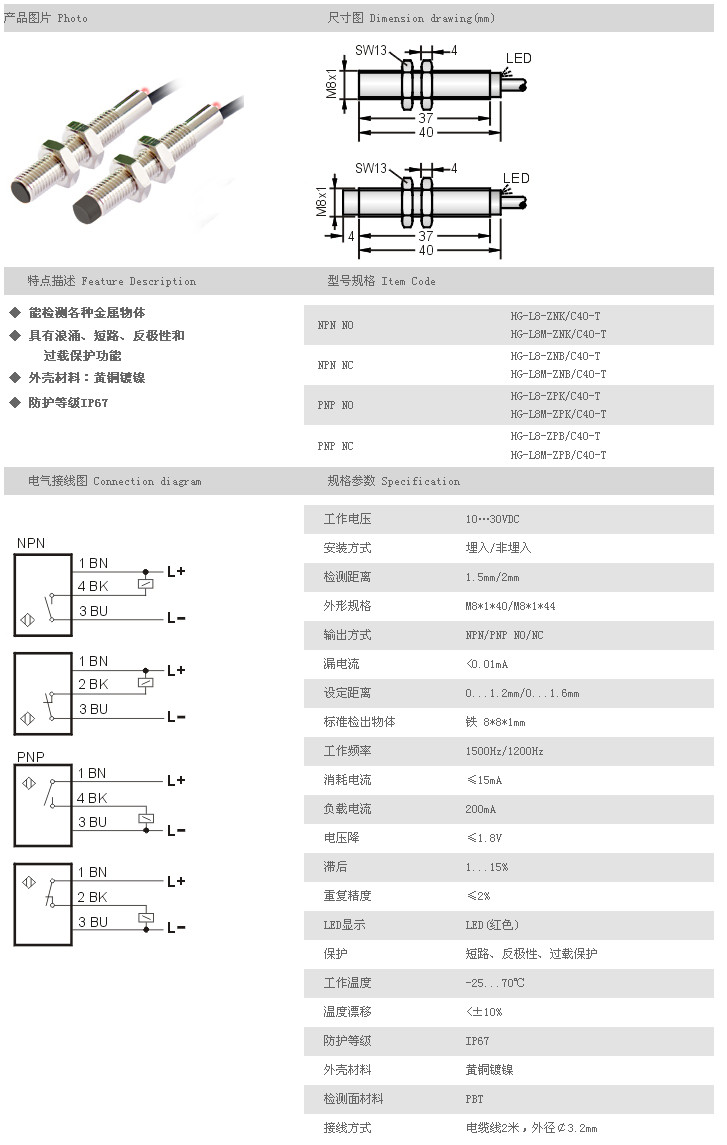 防水/防油/防腐蝕接近開(kāi)關(guān) HG-L8-ZNK/C40-T,HG-L8M-ZNK/C40-T,HG-L8-ZNB/C40-T,HG-L8M-ZNB/C40-T,HG-L8-ZPK/C40-T,HG-L8M-ZPK/C40-T,HG-L8-ZPB/C40-T,HG-L8M-ZPB/C40-T,