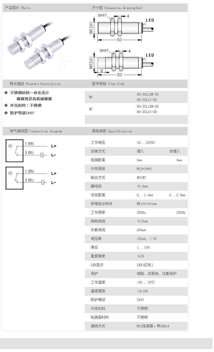 金屬探頭型接近開關(guān) HG-JSL12M-ZK,HG-JSL12-ZK,HG-JSL12M-ZB,HG-JSL12-ZB,