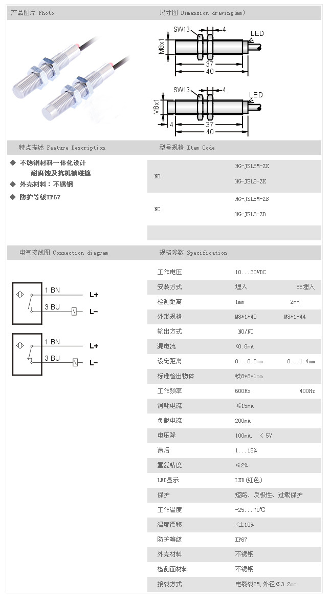 金屬探頭型接近開關(guān) HG-JSL8M-ZK,HG-JSL8-ZK,HG-JSL8M-ZB,HG-JSL8-ZB,