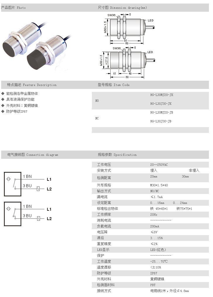 遠(yuǎn)距離型接近開關(guān) HG-L30MJ20-JK,HG-L30J30-JK,HG-L30MJ20-JB,HG-L30J30-JB,