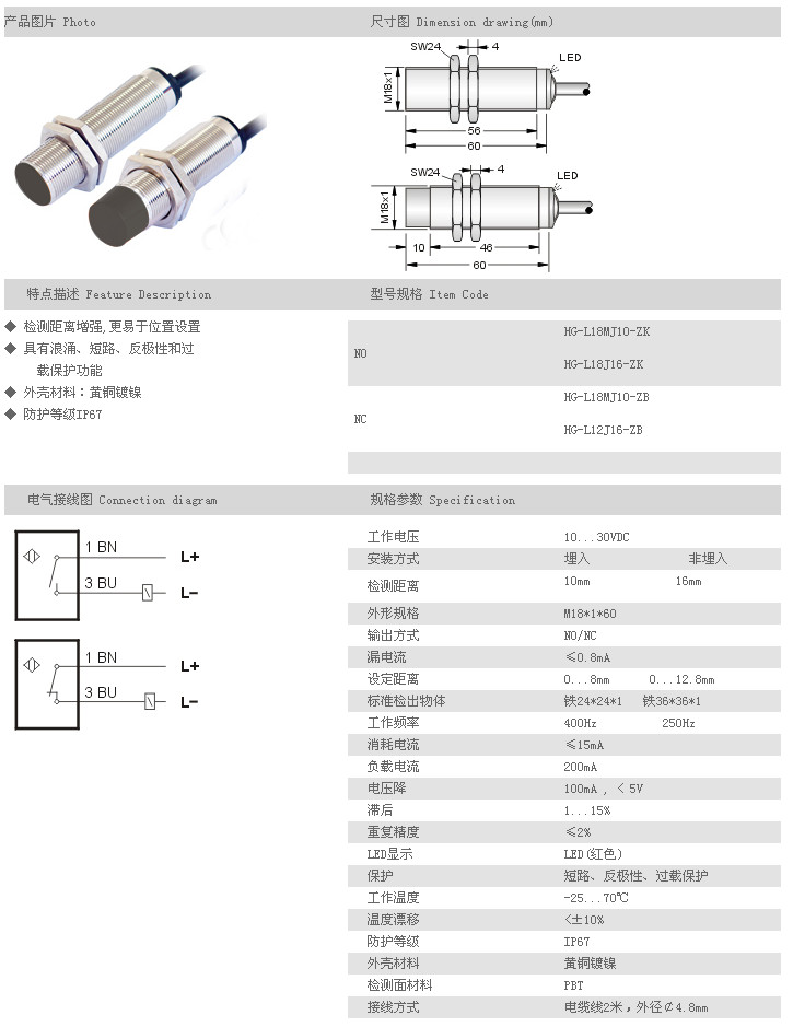 遠距離型接近開關(guān) HG-L18MJ10-ZK,HG-L18J16-ZK,HG-L18MJ10-ZB,HG-L18J16-ZB,