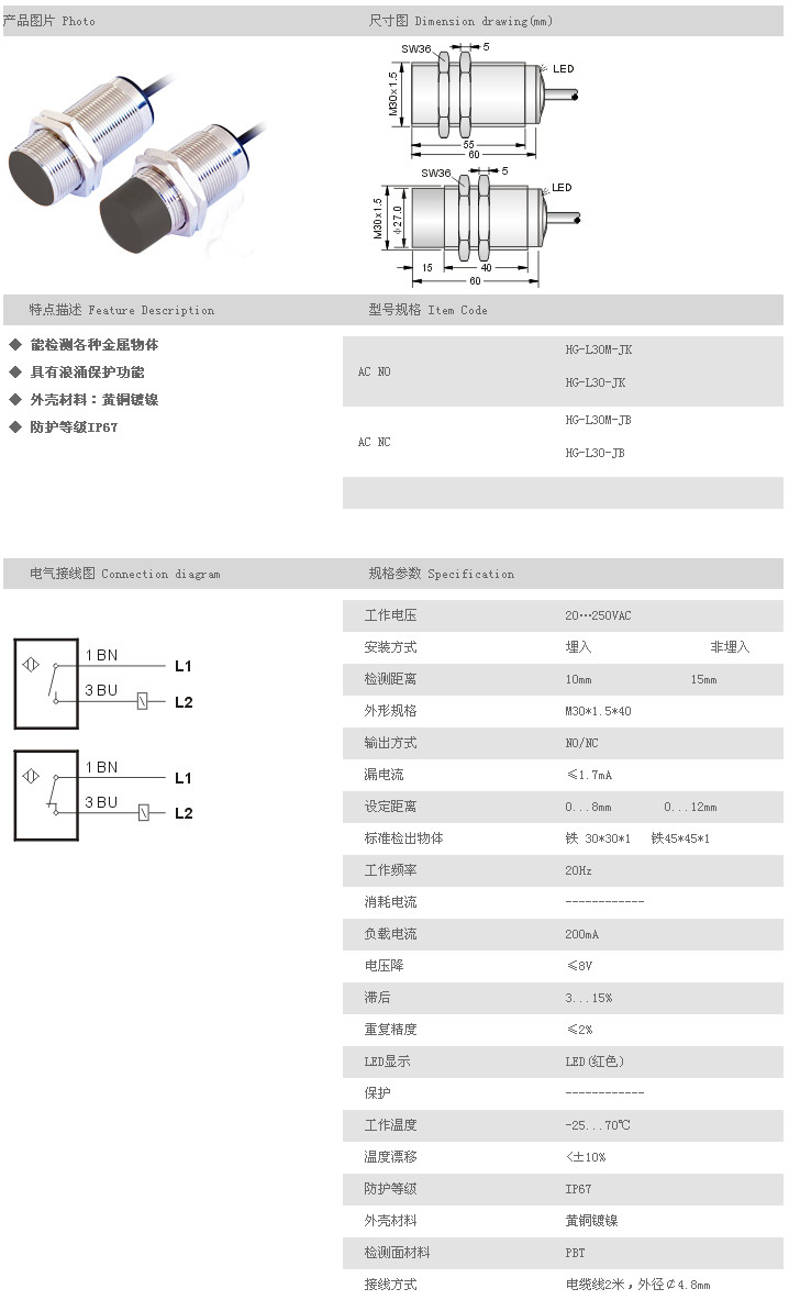 L30圓柱型接近開關 HG-L30-JK,HG-L30M-JK,HG-L30-JB,HG-L30M-JB,