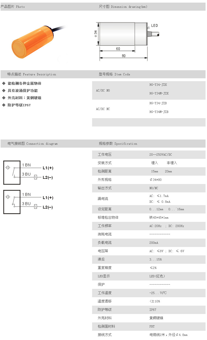 Y34圓柱型接近開關 HG-Y34-JZK,HG-Y34M-JZK,HG-Y34-JZB,HG-Y34M-JZB,