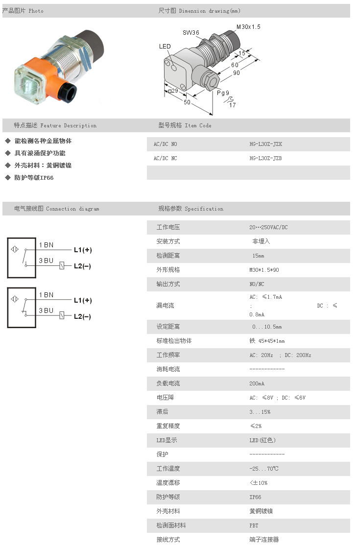 L30Z圓柱型接近開關(guān) HG-L30Z-JZK,HG-L30Z-JZB,