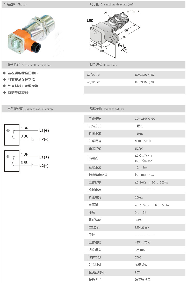 L30MZ圓柱型接近開關(guān) HG-L30MZ-JZK,HG-L30MZ-JZB,