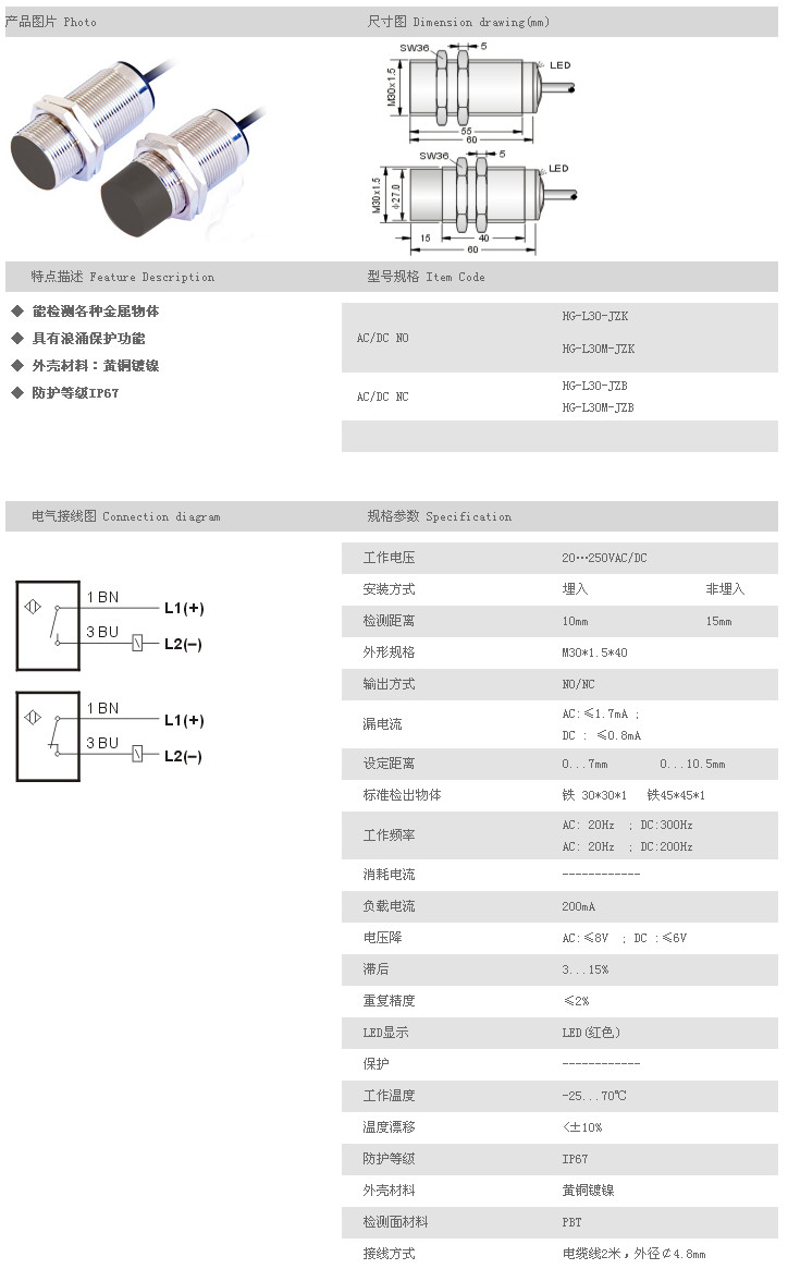 L30圓柱型接近開關(guān) HG-L30-JZK,HG-L30M-JZK,HG-L30-JZB,HG-L30M-JZB,