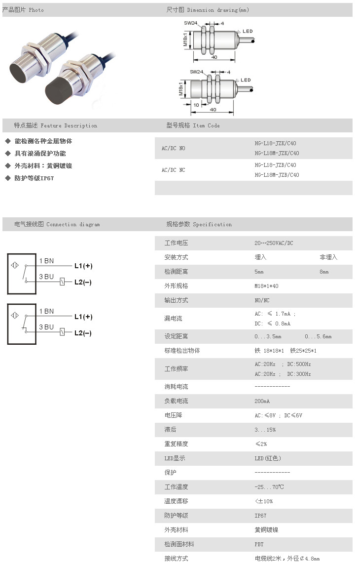 L18短圓柱型接近開關(guān) HG-L18-JZK/C40,HG-L18M-JZK/C40,HG-L18-JZB/C40,HG-L18M-JZB/C40,