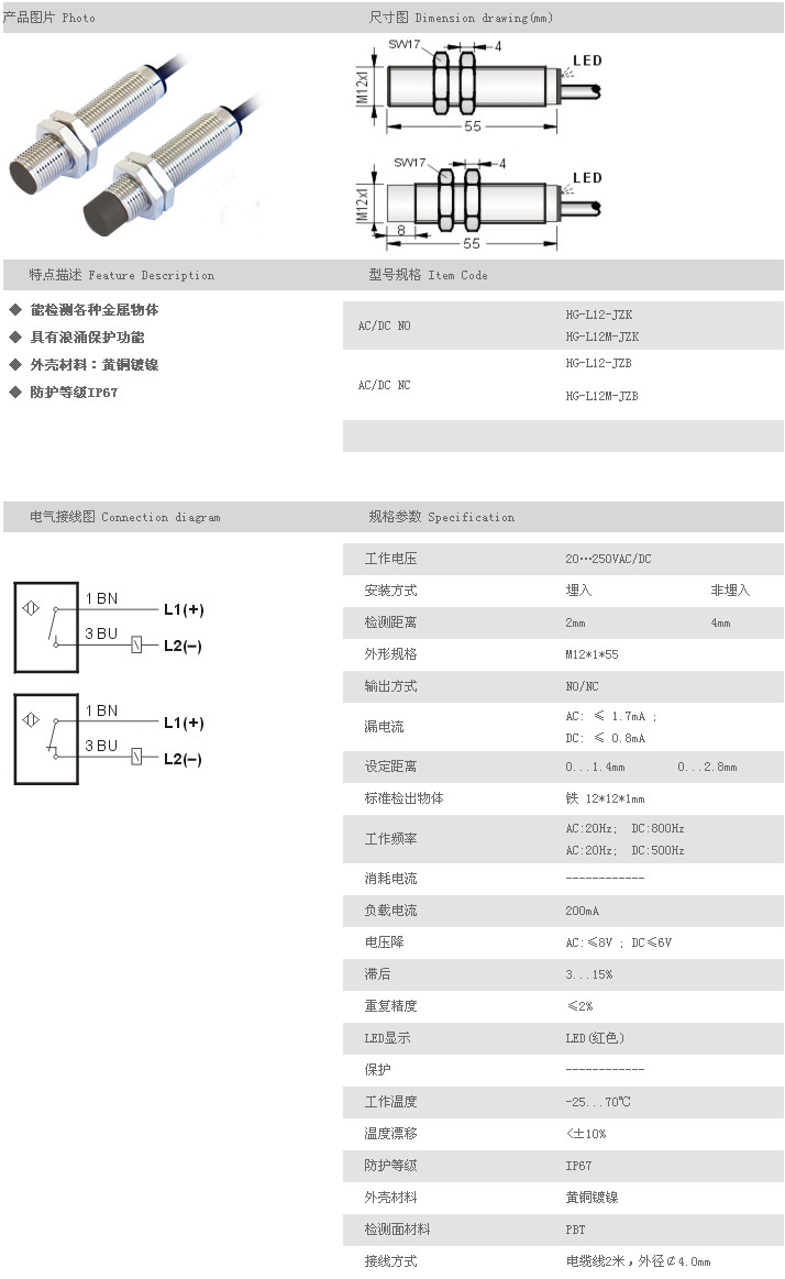 L12圓柱型接近開關(guān) HG-L12-JZK,HG-L12M-JZK,HG-L12-JZB,HG-L12M-JZB,