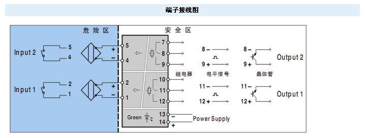 接收來自危險區(qū)域的開關(guān)或接近開關(guān)信號,通過安全柵隔離,以繼電器觸點(diǎn)(電平信號或晶體管)輸出方式傳送至安全區(qū)的控制系統(tǒng)或其它組合儀表。