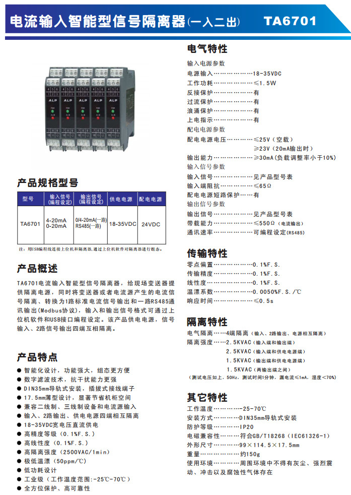 TA6701,電流輸入智能型信號隔離器(一入二出)
