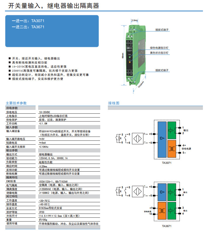 TA3071,TA3671,開(kāi)關(guān)量輸入、繼電器輸出隔離器