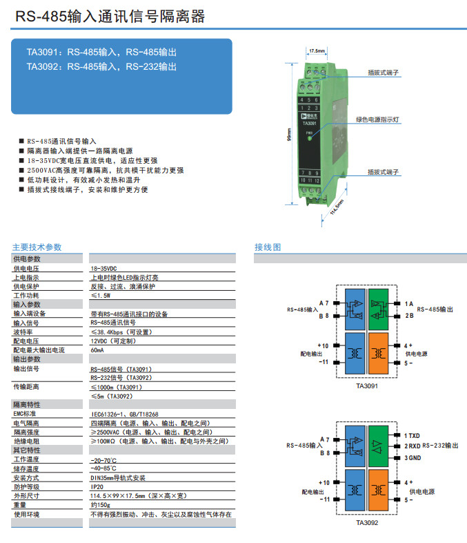 TA3091,TA3092,RS-485輸入通訊信號(hào)隔離器