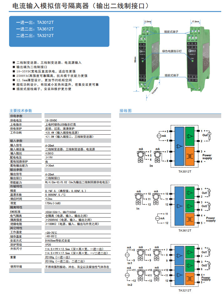 TA3012T,TA3612T,TA3212T,電流輸入模擬信號隔離器