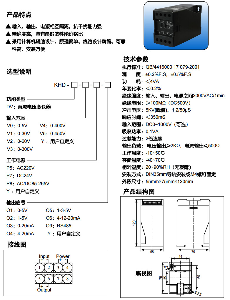 描述: 此型號為直流電壓變送器,輸入信號為直流0~300V,輸出4~20mAdc, 工作電源DC18~90V