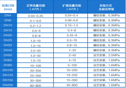 | 儀表口徑(mm) | 4、6、10、15、20、25、32、40、50、65、80采用螺紋連接 |