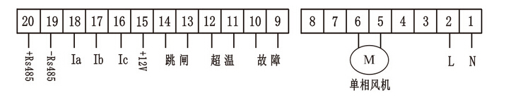 注:產品帶有485通訊輸出(端子19,20)標準的MODBUS,同時帶有3路4~20mA模擬量輸出(Ia、Ib、Ic,端子18,17,16)這2項功能為可選功能,單相風機的接線圖如上圖所示。