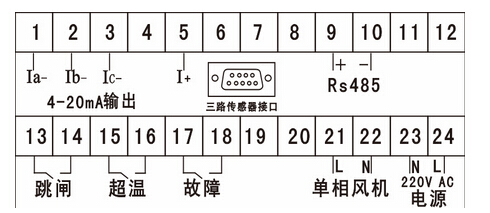 5、該裝置可對(duì)A、B、C三相繞阻溫度實(shí)現(xiàn)三路獨(dú)立的4~20mA模擬量輸出。