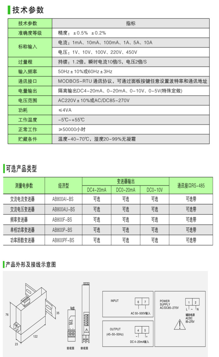 規(guī)格:輸入AC0-5A 輸出DC4-20mA 或DC0-20mA