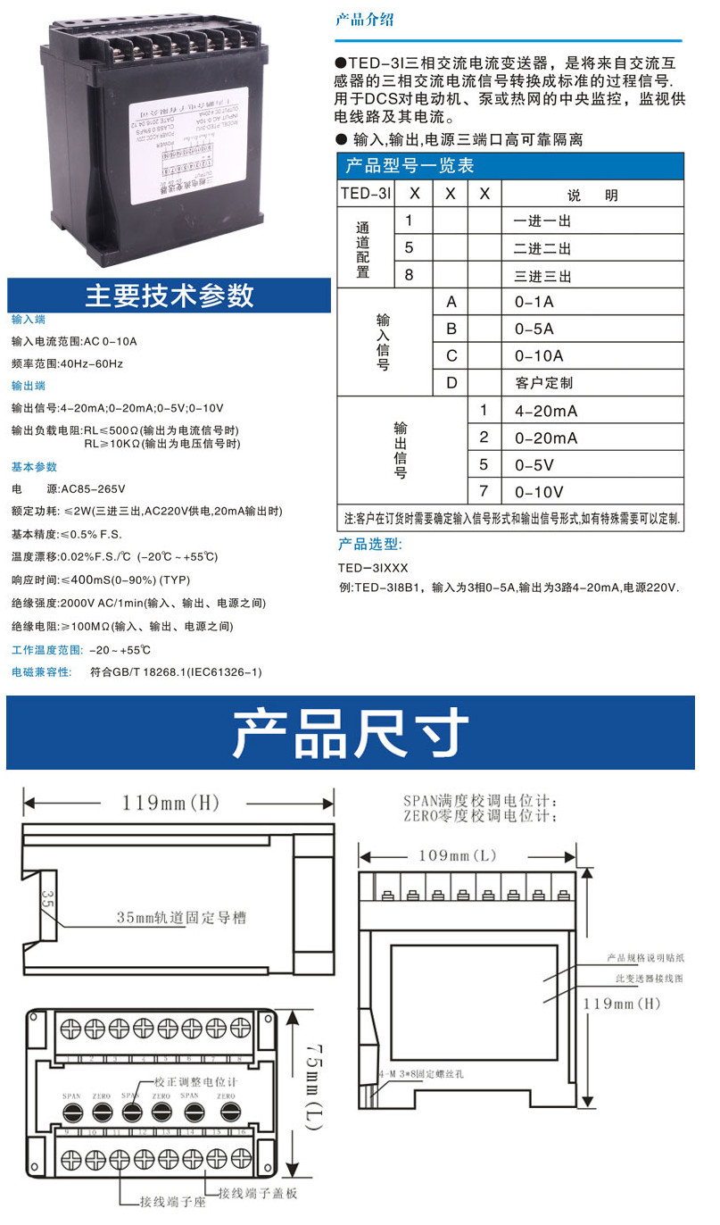 TED-3I1A1,TED-3I1B5,TED-3I1C2,TED-3I5B1,TED-3I5C7,TED-3I8D7,TED-3I,三相交流電流變送器