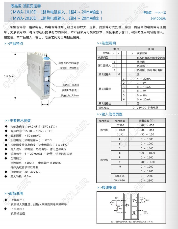 MWA-1010D,MWA-1030D,MWA-1060D,MWA-2030D,MWA-2050D,MWA-3040D,MWA-3060D,溫度變送器