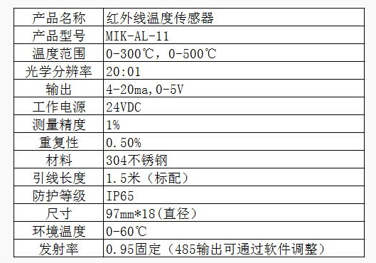 MIK-AL-11紅外溫度傳感器廣泛應(yīng)用于煙草、加熱爐、食品、橡膠、造紙、塑料、包裝、印染紡織、電氣、復(fù)合材料、設(shè)備配套等。
