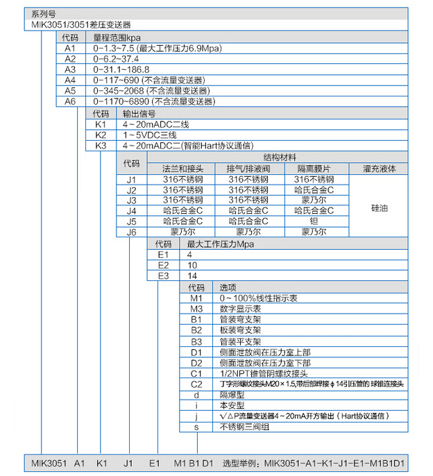 例如:MIK3051-A1(0.6)-K1-J1-E1-M1B1D1 表示