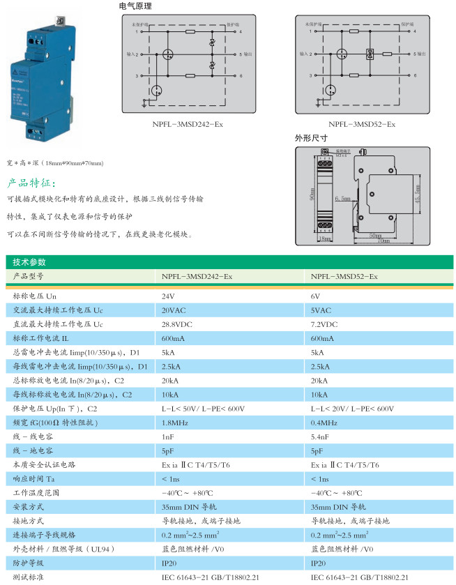 NPFL-3MSD52-Ex,NPFL-3MSD242-Ex,三線制本安型信號浪涌保護器(浮地)